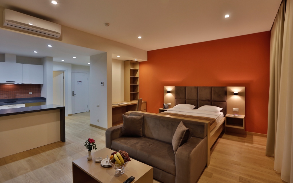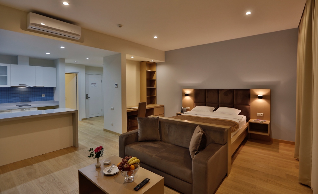 Sahəsi 50 m2 olan apartamentlər böyük zövqlə tərtib edilib. Xəzər dənizinin gözəl mənzərəsini bütün otaqlardan seyr etmək mümkündür. Otaqlarda qonaqlar üçün komfortlu şərait yaradılıb. Bütün otaqlar mətbəx və müvafiq avadanlıqlarla təmin edilib. Otel-apartament kompleksində sakinlərə aşağıdakı xidmətlər göstərilir: