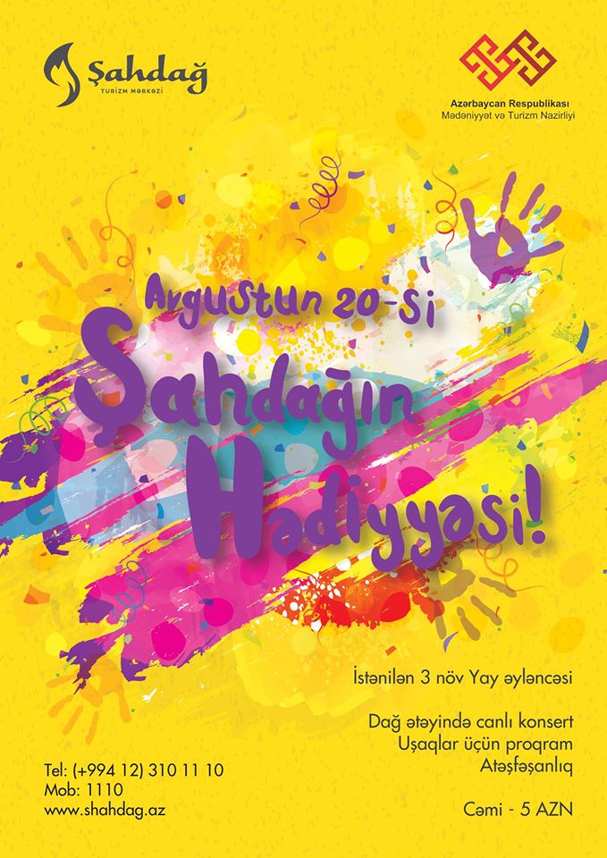 Avqustun 20-də Mədəniyyət və Turizm Nazirliyinin tabeliyində olan “Şahdağ” Turizm Mərkəzində “Şahdağın hədiyyəsi” adlı xüsusi əyləncəli konsert proqramı təşkil ediləcək. Həmin gün mərkəzə üz tutanlar simvolik qiymət ödəməklə çoxsaylı xidmətlərdən yararlanmaq imkanı qazanacaq, ziplayn, trotinnet, dağ velosipedi, bob kart, seqvey kimi maraqlı yay əyləncələrindən üçünü eyni zamanda sınaqdan keçirmək şansı əldə edəcəklər.