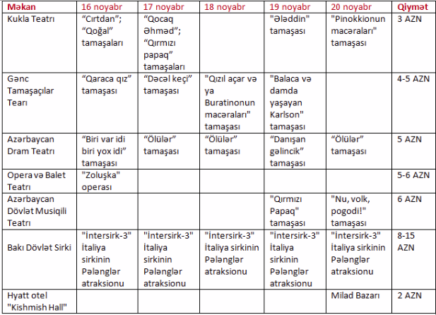 Uşaqların bu günləri maraqlı keçirməsi üçün teatr və digər əyləncə mərkəzlərində tədbirlər keçiriləcək. Sizə onların siyahısını, qrafikini və qiymətini təqdim edirik