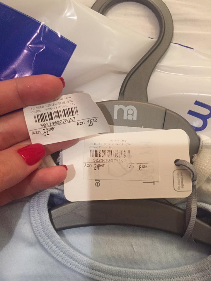 Müştəri yazır: ““Mothercare Azerbaijan” 50% endirim elan edib. Aldığım mal 50 faiz endirimdə idi. Ən üstdəki etiketdə 32.20 AZN normal qiyməti və endirimi ilə 16.10 AZN olub. Etiketi evdə qopardıqda altındakı qiyməti gördüm. Deməli, məhsul 24.00 AZN olub əvvəl və 30% endirimlə 16.80 AZN-ə düşüb. Elə bunu düzgün 30% adıyla satın da...”