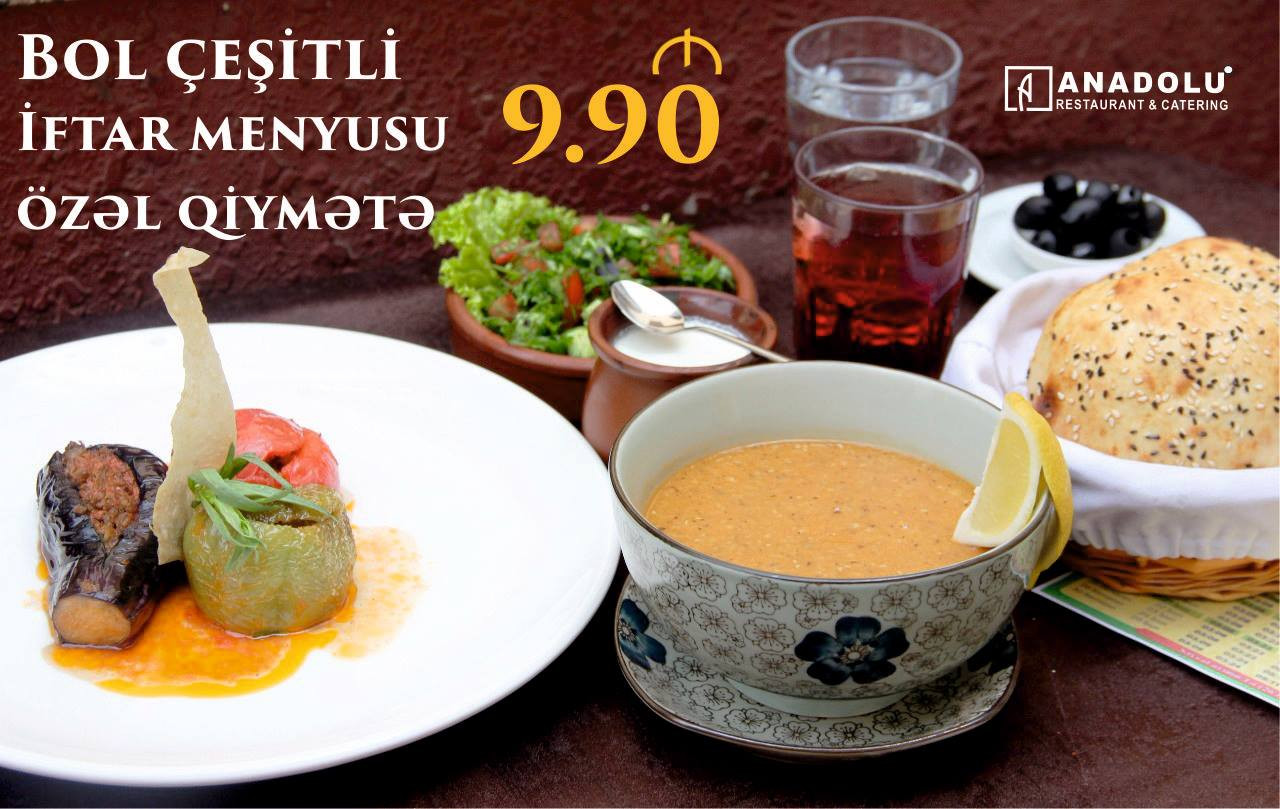 “Anadolu” restoranı bu Ramazan ayı öncəki illərdəki kimi müştərilərinə iftar menyusu təklif edir. Restoran müştərilərə iftar yeməklərini çatdırılma ilə təklif edir. Ramazan ayında salat, şorba, isti yemək, xurma, çörək və su daxil iftar menyusunun çatdırılma ilə 9.90 manata başa gəlir. Restoran imsak vaxtı üçünsə adambaşı 12 manatlıq açıq bufet təklif edir.