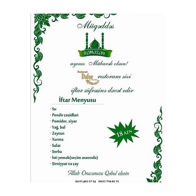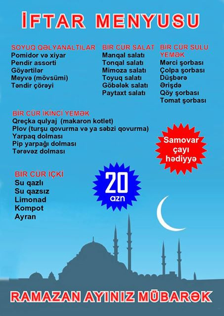 «Bayramoğlu restoranı»nın iftar menyusuna isə şorba, lavaşda dönər, mərci, xurma, su, çayla südlac daxildir. İftar süfrəsi 11,9 manata başa gələcək.