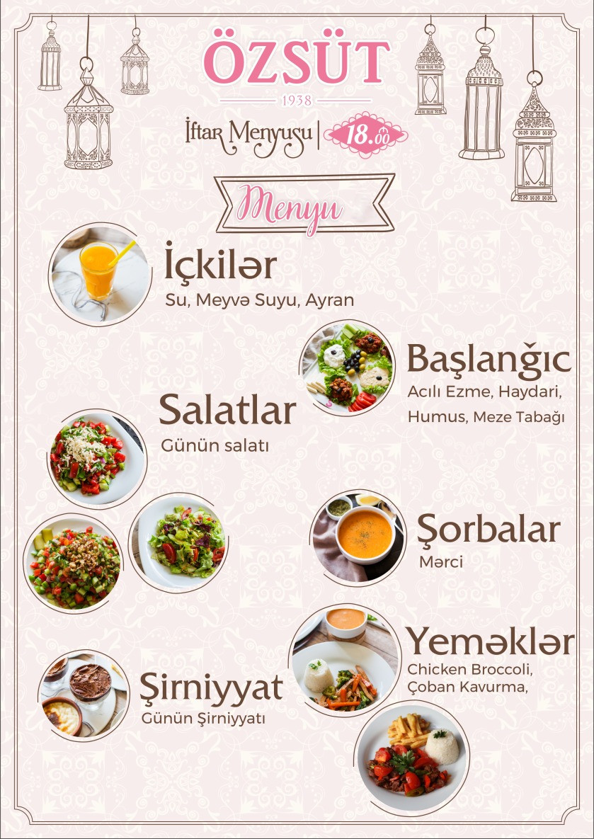 Özsüt Baku Ramazan ayında müştərilərə açıq bufet xidməti təklif edir. İmsak menyusunun qiyməti 12, iftar isə 18 manatdır. Qeyd edək ki, 7 yaşa qədər uşaqlar üçün yeməklər pulsuz, 7-12 yaş arası uşaqlar üçün 50% endirimlə təklif edilir.