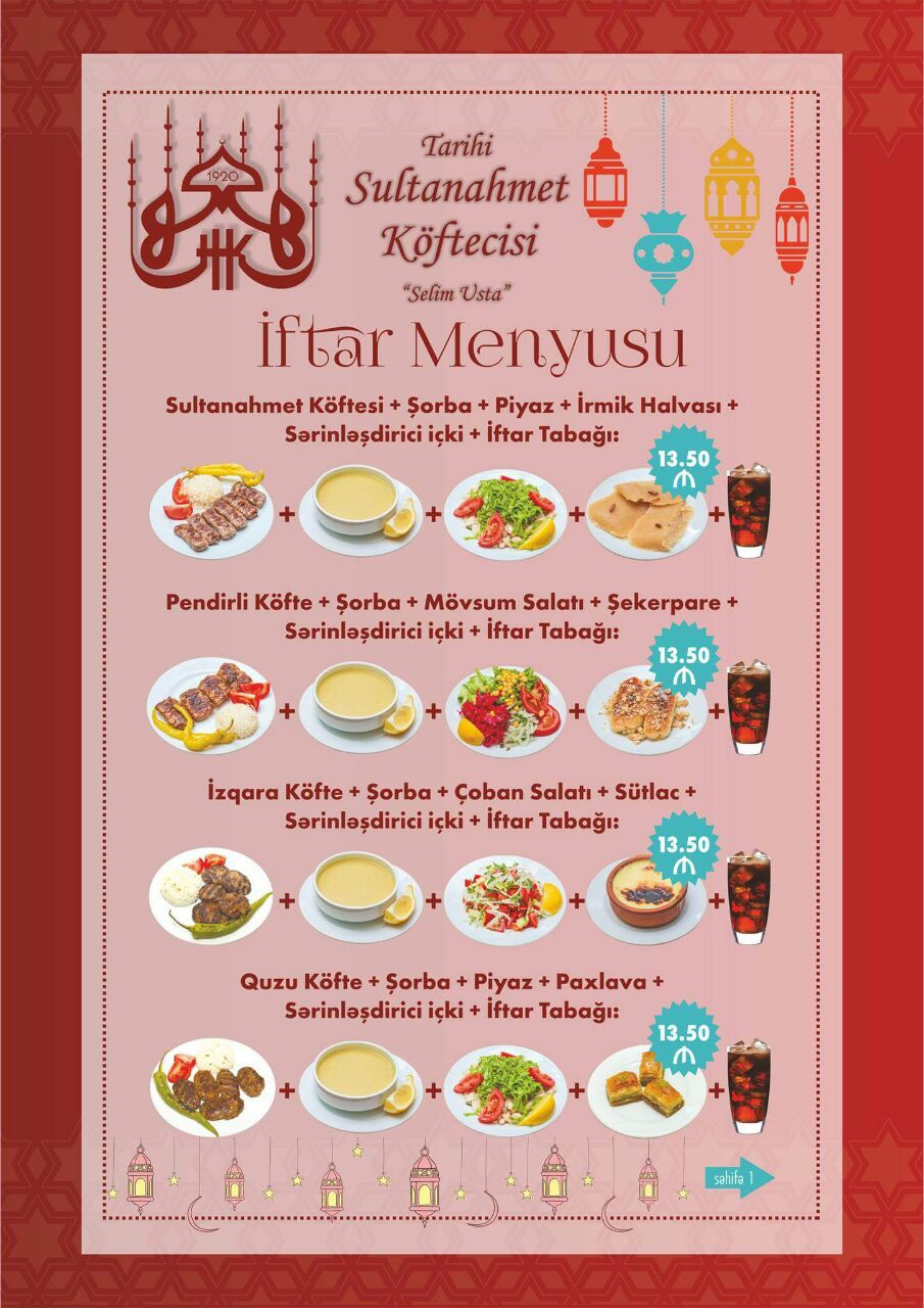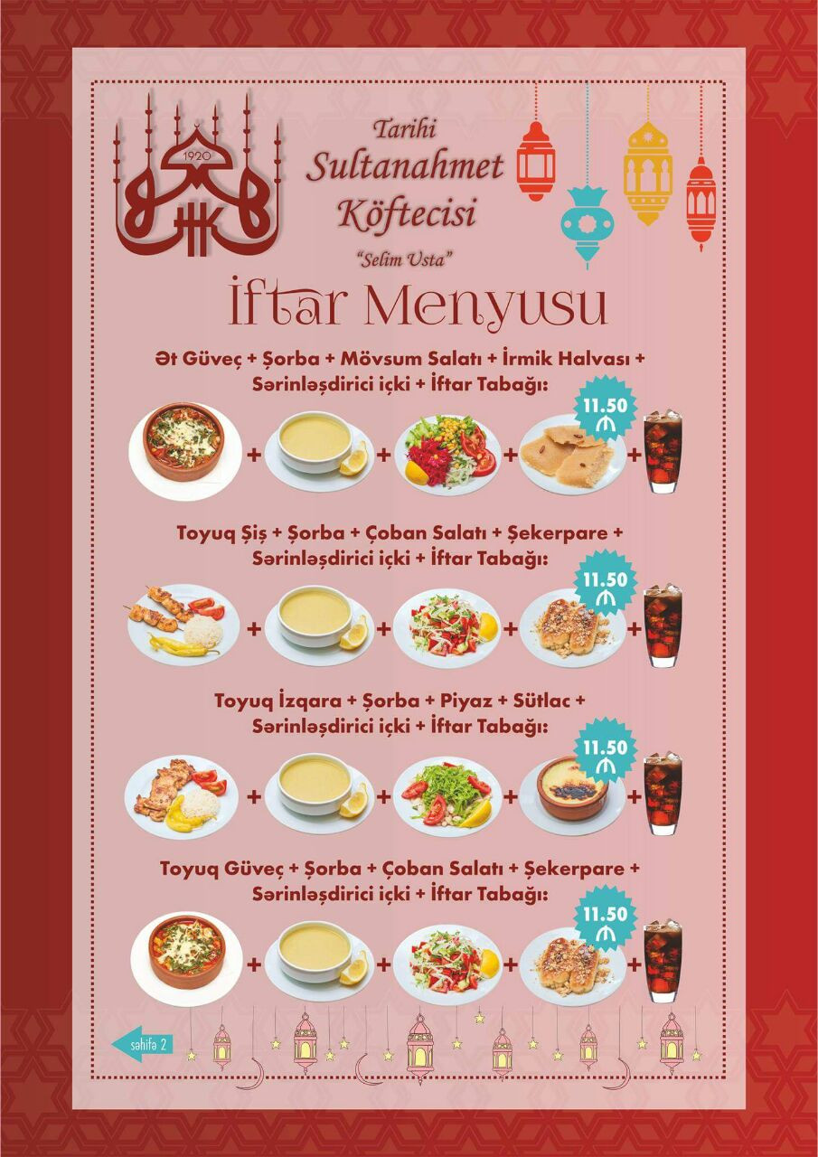 Türk mətbəxinin təmsilçisi bu ildə iftar menyusu tərtib edib. Qiymətlər 11.50 – 13.50 manat arasında dəyişir.