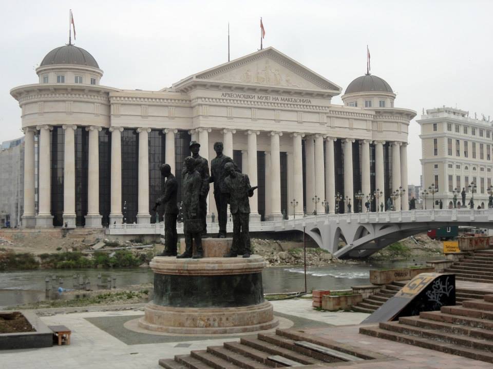 Vardar çayı üzərində Fatih Sultan Mehmet xanın 1451-1469-cu illərdə tikdirdiyi, 200 m-lik uzunluğu olan körpü Osmanlı yadigarıdır. Körpünü keçdikdən sonra qarşınıza Makedonya meydanı çıxır. Skopyanın ən böyük meydanı olan Makedonya meydanı bütün önəmli tədbirlər, festivallara ev sahibliyi edir. Meydanın tam ortasında Makedoniyalı İskəndərin heykəli yerləşir. Hündürlüyü 15 m olan bu heykəl axşamları müxtəlif rəngli işıqlarla işıqlandırılmış su şousu ilə diqqət çəkir. Salonikdə Makedoniya İskəndərin bu heykəlinə nəzirə bir heykəl ucaldılıb. Gedib İskəndərin o heykəlin də görmüşük. Vardar çayı üzərində bir də İncəsənət körpüsü (Мost na umetnosti) var ki, üstündə bütün incəsənət adamlarının heykəli sıralanıb. Ümumuyyətlə, Skopya elə bil heykələ boğulub. Şairlərin, bəstəkarların, qəhrəmanların, dilənçinin, bir sözlə heykəl qoyula biləcək hər kəsin heykəlinə rast gəlinir burda. İqtisadi vəziyyətin aşağı olduğu bir ölkə üçün bu qədər heykəl həddindən çoxdur. Makedonlar dövlətin pulları belə boş heykəllərə xərcləməsinə dəfələrlə etiraz etmiş, küçələrə axışmışlar.