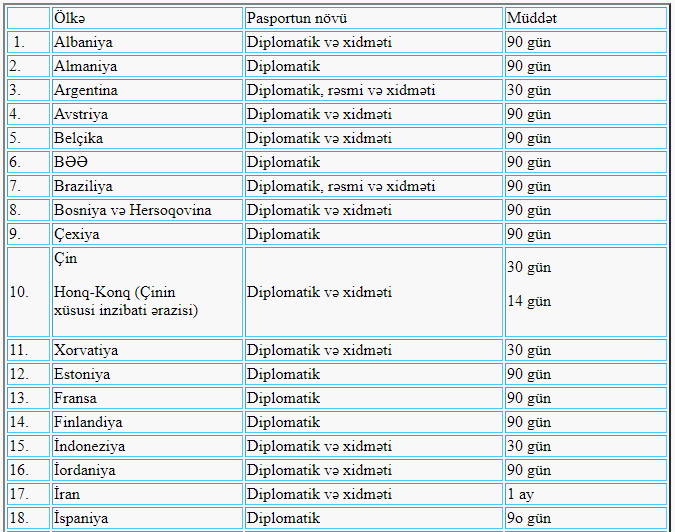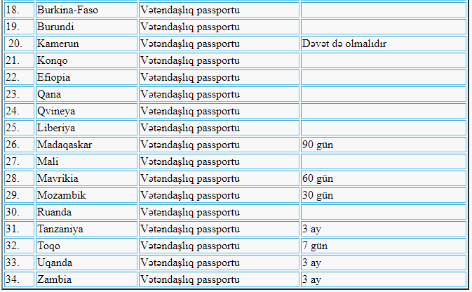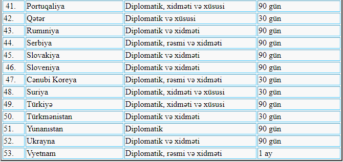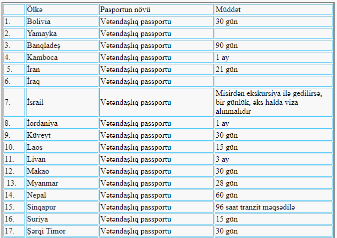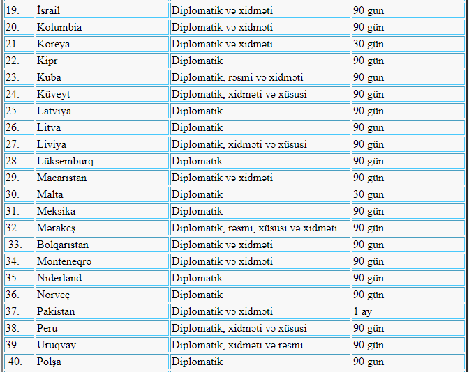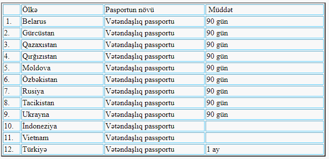 1-ci qrup: Bu ölkələrə vətəndaşlıq passportu ilə getmək və qeyd olunan müddət qədər orda yaşamaq mümkündür.
