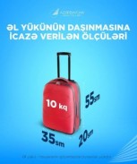 Yay mövsümü və artan sərnişin sıxlığı ilə əlaqədar, bir daha xatırlatmaq istərdik ki, əl yükünün ölçüləri (sərnişinlərin təyyarənin salonuna götürə biləcəyi yük) məhduddur. Ölçülər: 55х35х20 sm, icazə verilən maksimum çəki: 10 kq.