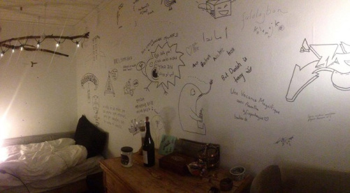 Elə oradakı qarlı günlərdən birində Amanda otaqdakı bir divarı göstərib dedi ki, mən istəyirəm bura evimdə qalan hər bir couchsurfer bir kəlimə yazsın, istəsən ilki də sən ola bilərsən. Mən də fürsəti boş vermək istəmədim. Qarın noyabr ayı üçün qeyri adi bir hava olduğunu Amandadan öyrənib divara “it was a snowy November day…” ifadəsini yazdım (yaradıcılığın və romantikanın bu qədəri). Divarın son halını aşağıdakı şəkildə görə bilərsiniz