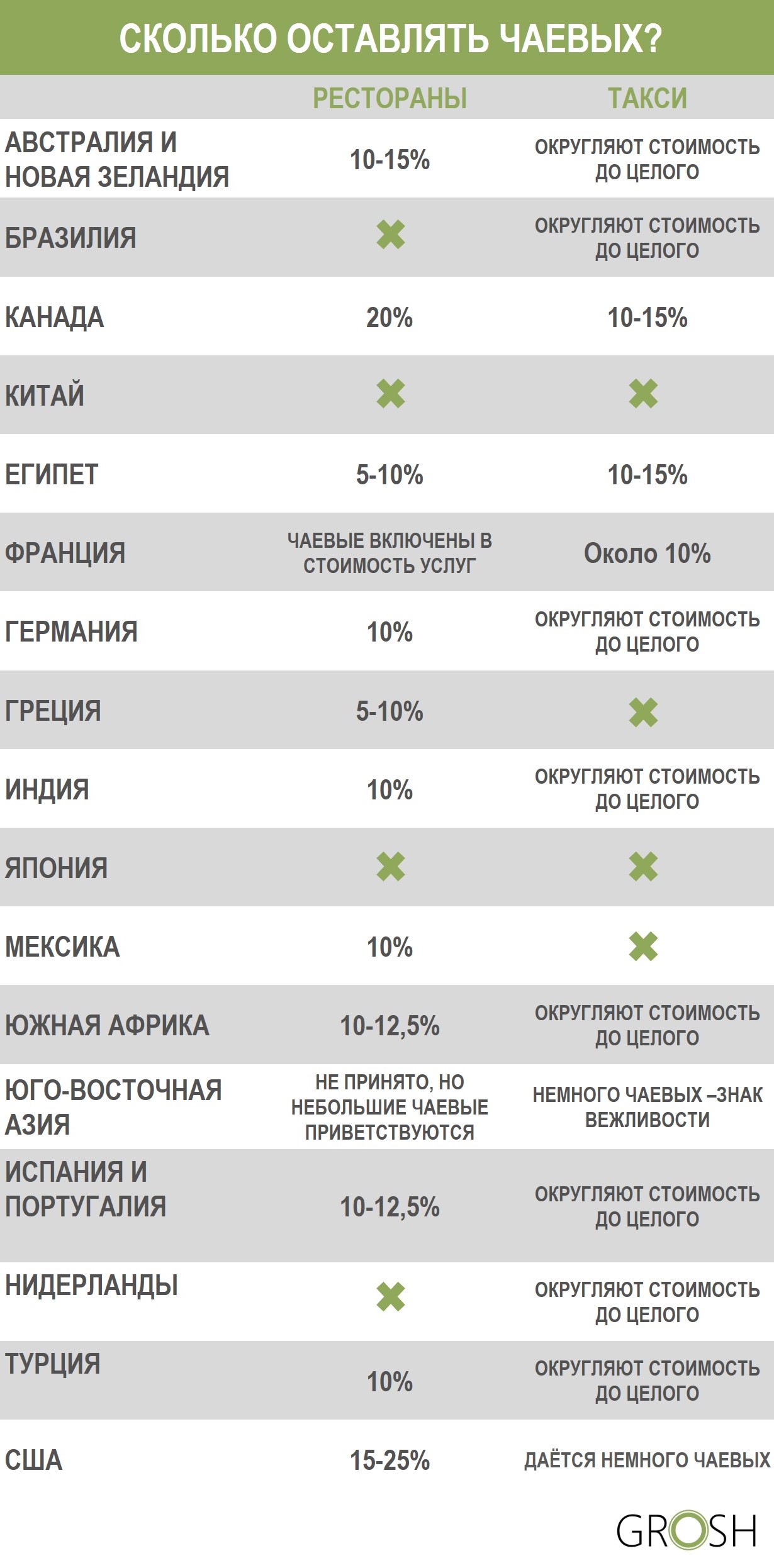 Британский туристический сайт сделал руководство по чаевым для тех, кто собирается выезжать за границу. Оказывается в разных странах есть свои особенности. Так, например, в Японии нет культуры чаевых, и, более того, если вы попытаетесь дать немного денег в местном ресторане официанту, он может обидеться. В Америке же наоборот, на вас обидятся, если вы ничего не оставите. Во Франции плата за обслуживание должна включаться по закону, но французы не будут против, если вы им всё же оставите пару монеток.