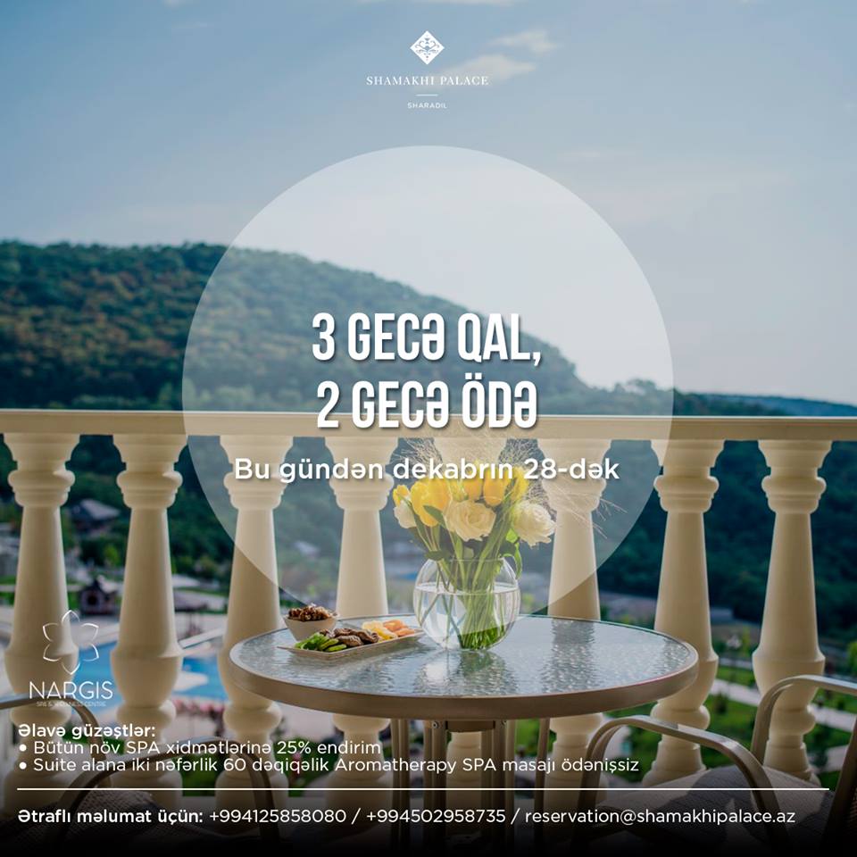 Shamakhi Palace Sharadil dekabrın 28-dək "3GECƏ QAL,2GECƏ ÖDƏ" kampaniyasina başlayıb. Endirim otelin bütün otaqlarına aiddir. 2nəfərlik otağın qiyməti 238 manatdan başlayır.Qiymətə səhər yeməyi,fitness və spa daxildir.