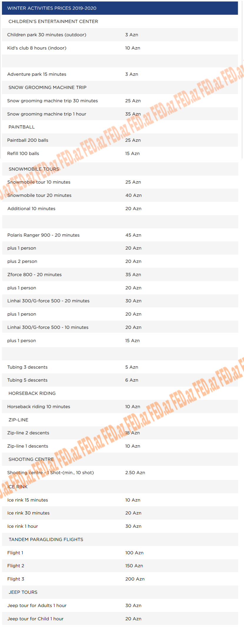 Əyləncə mərkəzində tam snoubord dəsti 46 manatdır. Sadəcə snoubord dəstinin bir günü 30 manatdır. Bu qiymətə dəbilqə, qış ayaqqabısı və snoubord daxildir. Ayrı - ayrılıqda isə qış ayaqqabısı 10 manat, snoubord 15 manat, şalvar-8 manat, dəbilqə 5 manat, gödəkcə isə 8 manatdır.