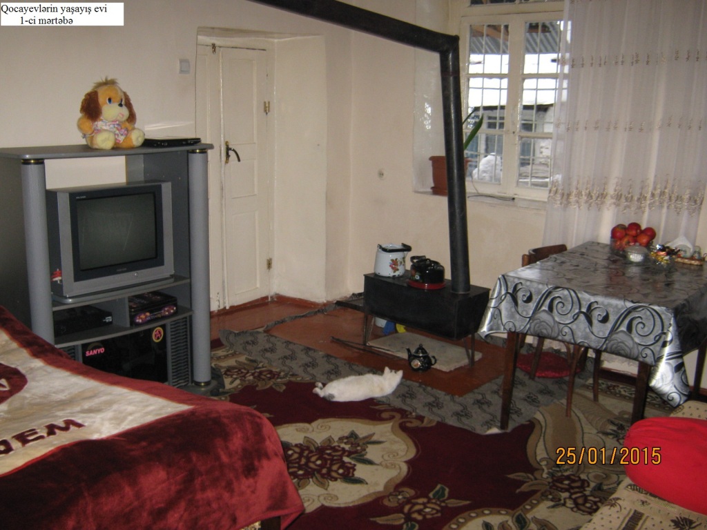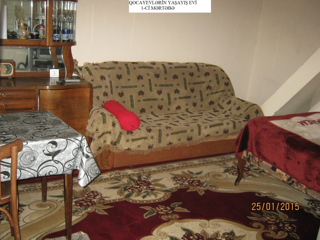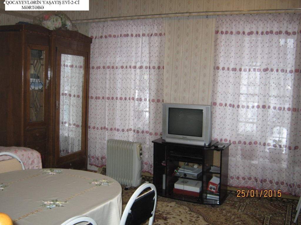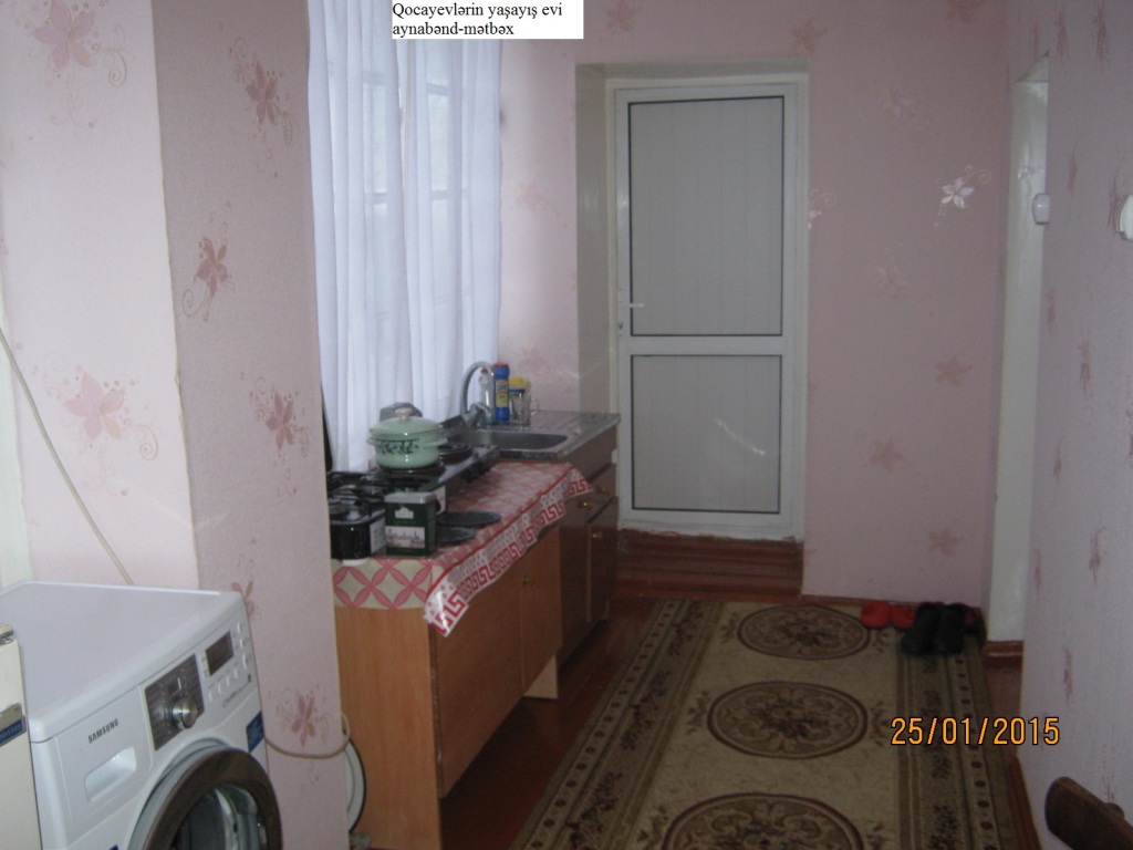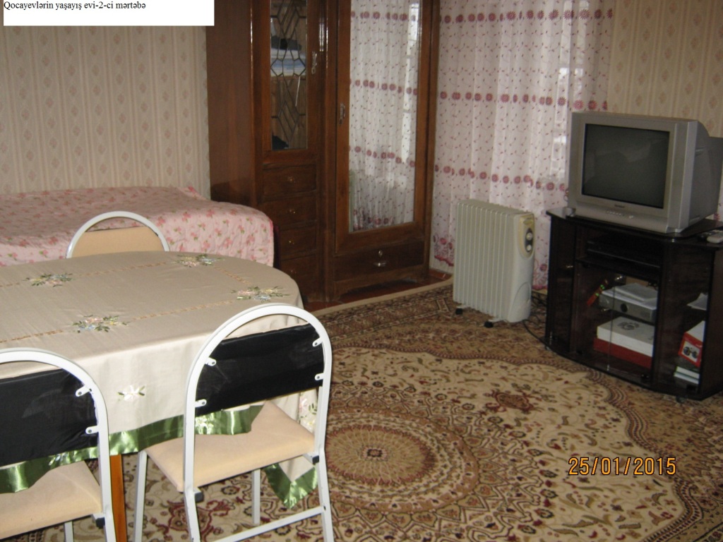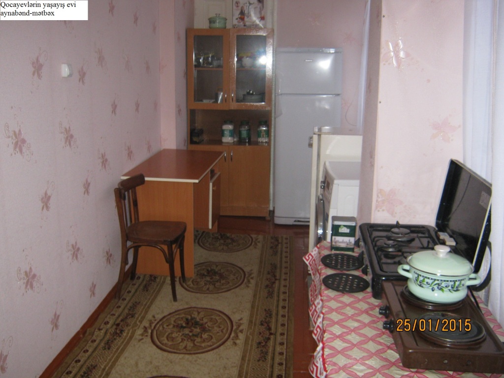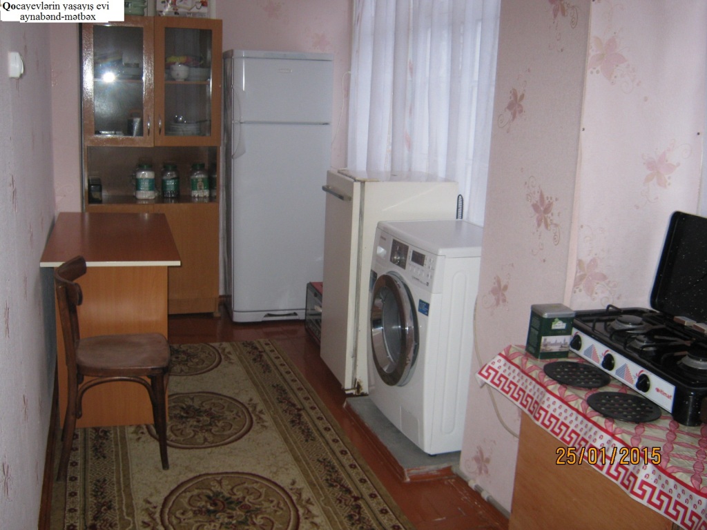 Otaqda 2 taxta çarpayı, divan və televizor var. Otağın qarşısındakı aynəbənd mətbəxdə qab şkafı, balon qaz plitəsi, soyuducu, paltaryuyan maşın, stol və stullar var.